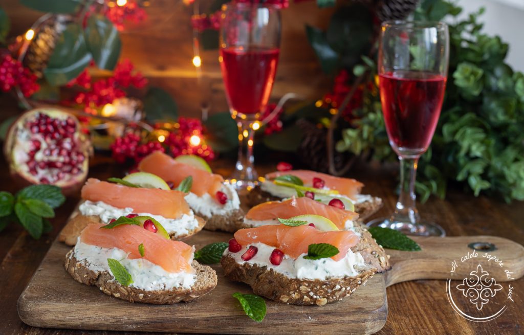 Brot-Canapés mit Robiola und Räucherlachs. Die Proben können beginnen: Weihnachten steht vor der Tür und wir sollten bereit sein, ein einzigartiges Festtagsmenü zuzubereiten! Zauberwort? Weihnachtsvorspeisen, die beeindrucken, natürlich!! Wisst ihr, was ich an der Festtagstafel liebe? Ich liebe Vorspeisen: mir würden allein die reichen, um einzigartig zu feiern, und zu den Vorspeisen, denen ich absolut nicht widerstehen kann, gehören diejenigen mit Räucherlachs! Genau deshalb fehlt er in meinem Kühlschrank nie, ein wertvoller Helfer bei der Zubereitung raffinierter und dekorativer Rezepte. Heute zeige ich euch, wie ihr im Handumdrehen köstliche Canapés mit Lachs zubereitet, die Geschmack und Farbe auf den Tisch bringen! Bereit? Ab in die Küche – aber vorher wie immer: Wenn ihr über neue Rezepte informiert bleiben wollt, könnt ihr meine Facebook-Seite (hier) und mein Instagram-Profil (hier) folgen.