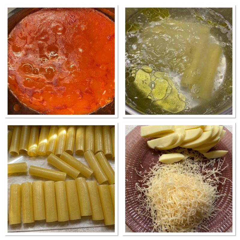 Nach dem Blanchieren legt ihr die Cannelloni auf ein sauberes Backpapier, reibt den Käse und schneidet den weichen Käse (z. B. Provola dolce) in Stücke.