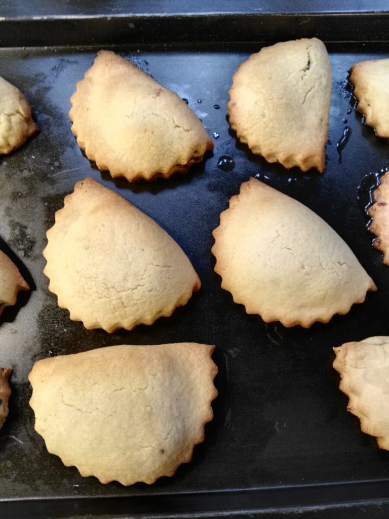 • Am nächsten Morgen den Mürbeteig zubereiten: Das Mehl auf die Arbeitsfläche geben, eine Mulde formen und die restlichen Zutaten hinzufügen. Knetet den Teig, bis er glatt und homogen ist, und stellt ihn dann für eine Stunde in den Kühlschrank. Nach der Ruhezeit den Teig etwa 0,2–0,3 mm dünn ausrollen, Kreise ausstechen, auf jeden Kreis einen gehäuften Esslöffel Füllung geben, die Ränder mit etwas Wasser bestreichen und zu einem Halbmond zusammenklappen. Die Cassatelle sollten mit der gezackten Form ausgeschnitten werden, wie auf dem Foto zu sehen. Nachdem ich überall im Internet und in Haushaltswarengeschäften vergeblich danach gesucht hatte, musste ich nach Agira fahren, um sie zu kaufen, und entdeckte, dass man sie im Baumarkt findet, weil es sich um ein handgearbeitetes Stahlobjekt der örtlichen Schmiede handelt. Wenn ihr sie braucht, kontaktiert einen örtlichen Eisenwarenhändler und lasst sie euch zuschicken.