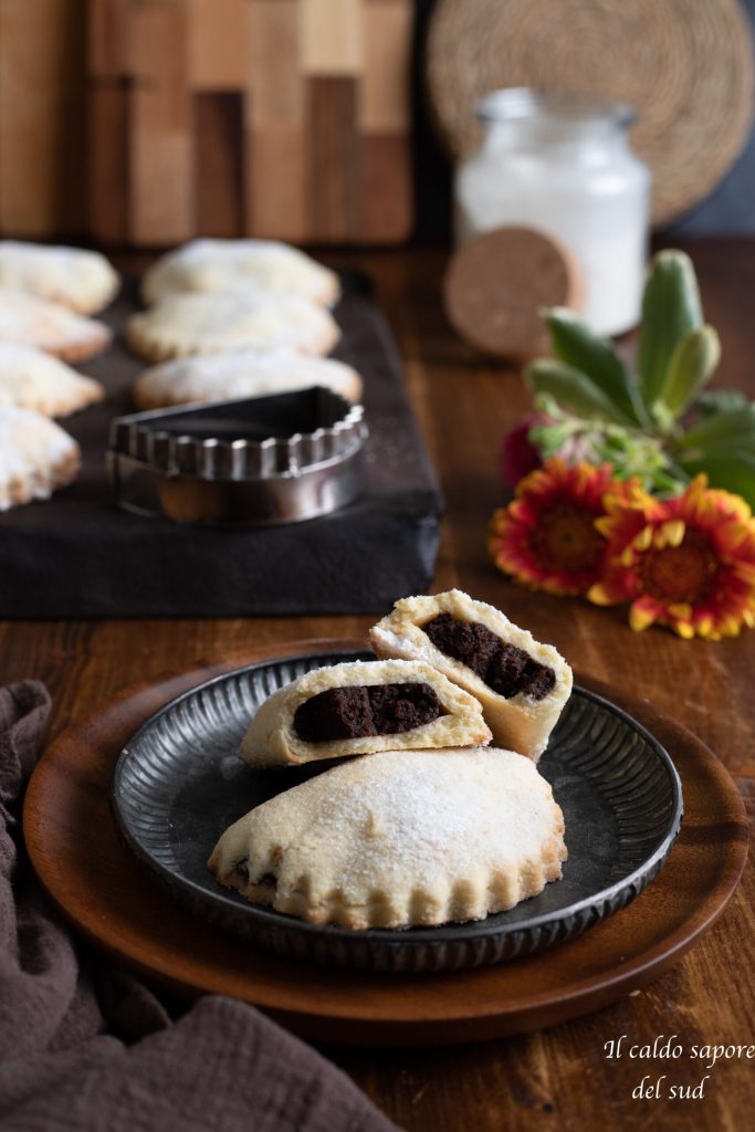 Typische Osterspezialität aus Agira im Raum Enna, heute in großen Teilen Ostsiziliens verbreitet. Diese Süßigkeiten haben eine unvergessliche Konsistenz; ihre Zartheit auf der Zunge macht sie zu einer echten Kostbarkeit. Die traditionellen Cassatelle von Agira sollten Halbmondform haben, mit der gezackten, gebogenen Kante, etwa 10 x 6 cm groß sein und unbedingt mit einer Form hergestellt werden, die man nur in Agira erwerben kann, da sie von den örtlichen Schmiedemeistern handgefertigt und nicht industriell produziert wird. Hergestellt auf Basis eines zarten Mürbeteigs, auch „pasta tenerina“ genannt, hellgolden gefärbt und mit Puderzucker bestäubt, enthalten sie eine Füllung aus Kakao, gerösteten Mandeln, Kichererbsenmehl, Zucker, vorzugsweise getrockneter Zitronenschale, Zimt und manchmal Nelken. Der ausgewogene Kakaogeschmack darf den Mandelgeschmack nicht überdecken; der Mürbeteig soll weder hart noch zu weich sein, sondern im Mund zergehen. Kurz gesagt: die Cassatelle von Agira nach alter Agira-Tradition sind kleine Juwelen der sizilianischen Konditorei, die man nicht verpassen sollte. Eine der Rezepte, die Sie auch in meinem mein Buch findet. Neugierig und bereit, sie selbst zuzubereiten? Dann los: ran an den Teig und folgt dem Rezept!