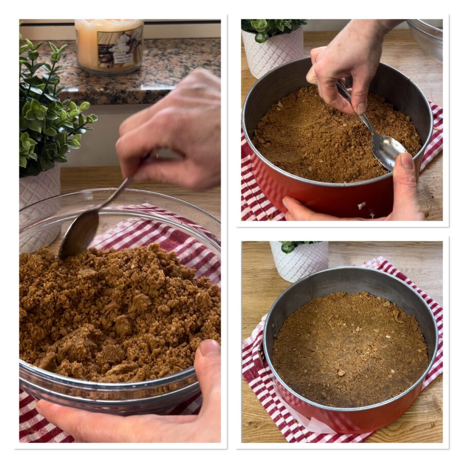 Vermengt diese Mischung mit den übrigen Cannoli-Bröseln. Legt den Boden einer Springform mit Backpapier aus, gebt die Keksmasse hinein, verteilt sie gleichmäßig und drückt sie mit der Rückseite eines Löffels, dem glatten Boden eines Glases oder einer Flasche fest. Stellt die Form in den Kühlschrank.