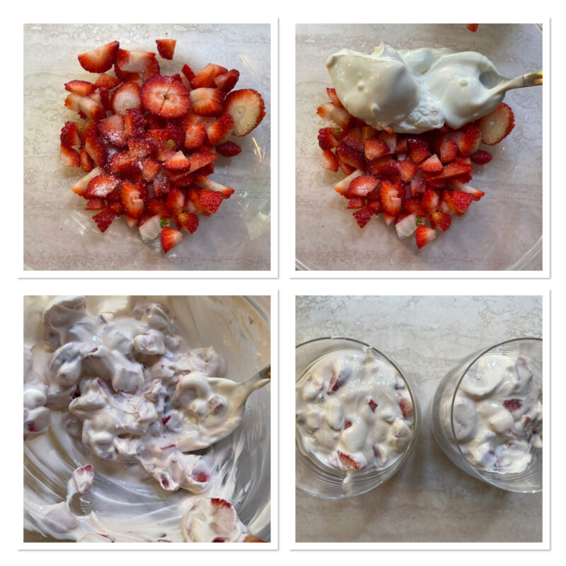 Wascht und schneidet die Erdbeeren oder anderes Obst, mischt sie mit dem nach Belieben gesüßten Joghurt. Schichtet die Gläser mit einer ersten Schicht Joghurt und Obst, einer zweiten Schicht rehydrierter Chiasamen und einer dritten Schicht Joghurt und Obst (ich habe die dritte Schicht püriert, um eine gleichmäßige Konsistenz zu erreichen).