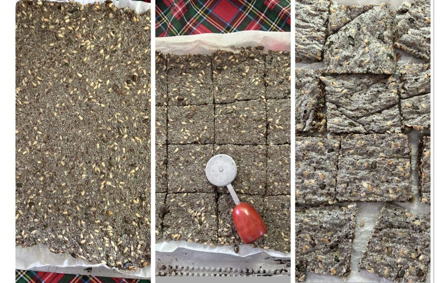 Backt im vorgeheizten Ofen bei 180°C für 20 Minuten. Nach der Zeit schneidet die Cracker mit einem Messer oder Pizzarad in Stücke und gebt sie zurück in den Ofen bei 70°C, bis sie vollständig durchgetrocknet sind. Wendet sie zwischendurch, damit sie auch auf der Unterseite trocknen (ca. 2 Stunden; diese Zeit habe ich als Ruhezeit im Ofen gerechnet).