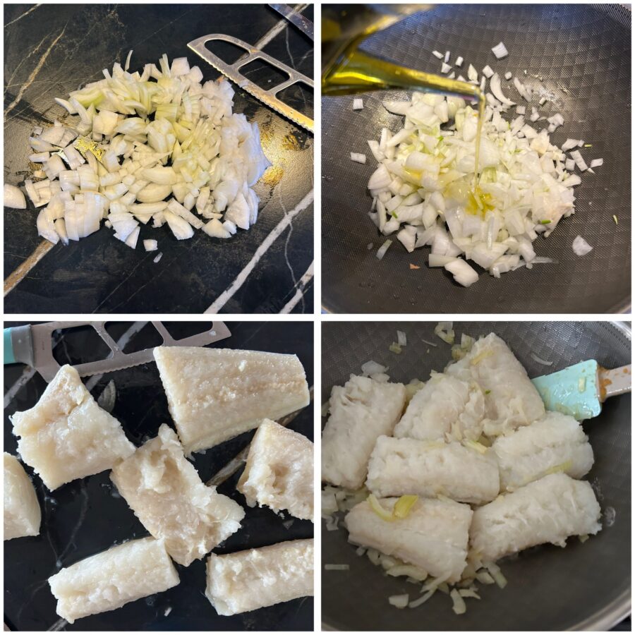 Nachdem ihr den Baccalà in kaltem Wasser entsalzt habt, abtropfen lassen, Haut und eventuelle Gräten entfernen und in gleichmäßige Stücke schneiden.