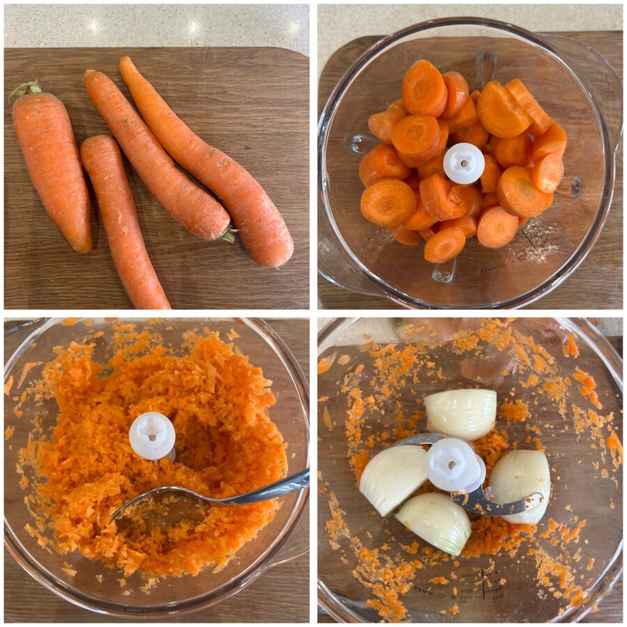 Gib dann die Zwiebelstücke dazu und zerkleinere sie. Du kannst das separat oder zusammen mit den Karotten machen, je nachdem welche Textur du bevorzugst.