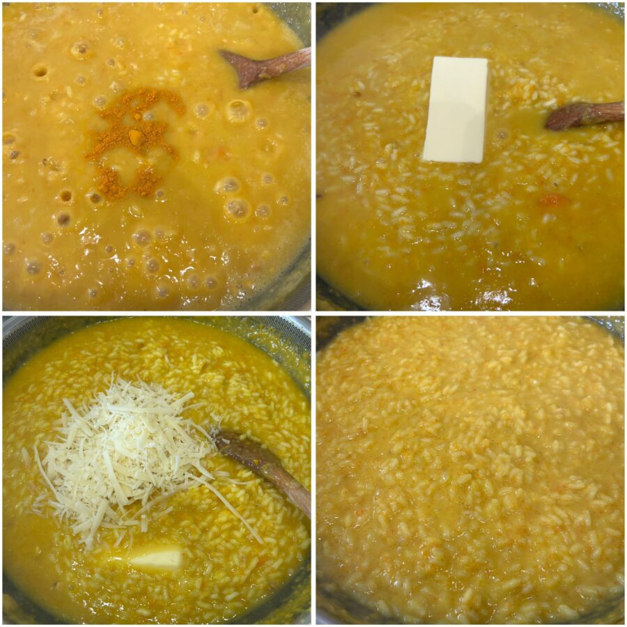 Gegen Mitte der Garzeit die Karottencreme unterheben und weiter kochen, dabei regelmäßig umrühren. Am Ende der Garzeit Kurkuma oder Safran hinzufügen — beide geben Farbe, haben aber unterschiedliche Aromen — und anschließend bei ausgeschalteter Hitze Butter und geriebenen Parmigiano einrühren. Kräftig rühren, bis ein cremiges, gut gebundenes Risotto entsteht.