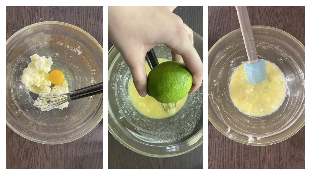 • Ei hinzufügen und unterrühren, dann Zitronensaft und Zitronenschale zugeben und gut vermischen.