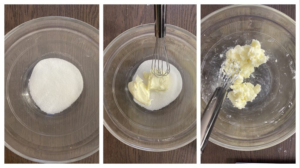 • Für die Zitronen-Crinkle-Cookies Butter (Zimmertemperatur) und Zucker in einer Schüssel vermischen und so lange rühren, bis eine cremige Masse entsteht.