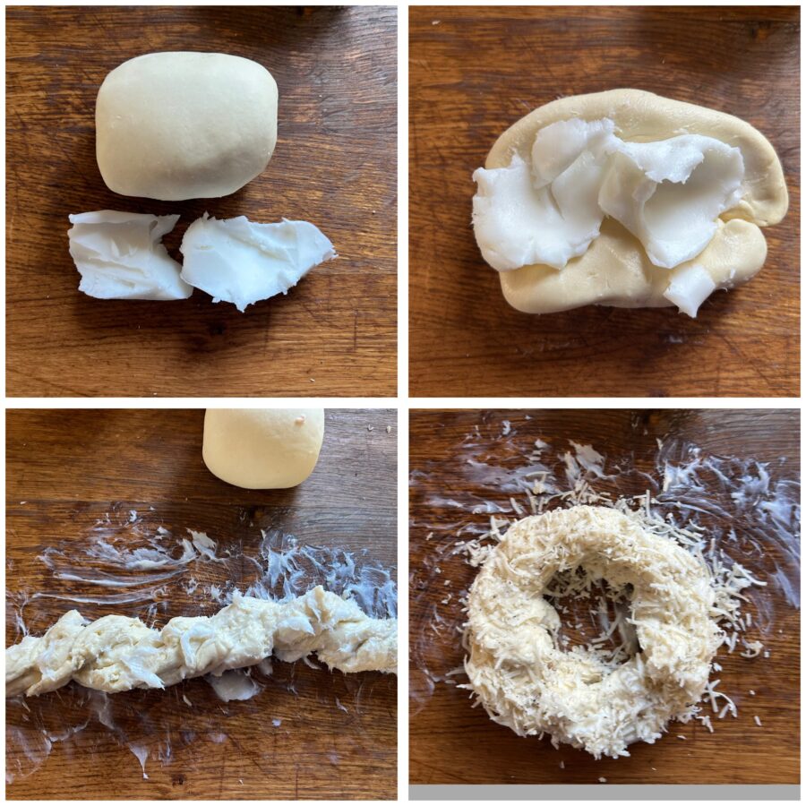 Wenn die Teiglinge aufgegangen sind, ziehe den Teig auseinander und arbeite das Schmalz grob ein, ohne dass es vollständig aufgenommen wird: Strecke den Teig, rolle ihn längs wie ein Seil auf und forme daraus Kränze. Wälze die Kränze in der Käse-Pfeffer-Mischung, sodass sie gut haftet.