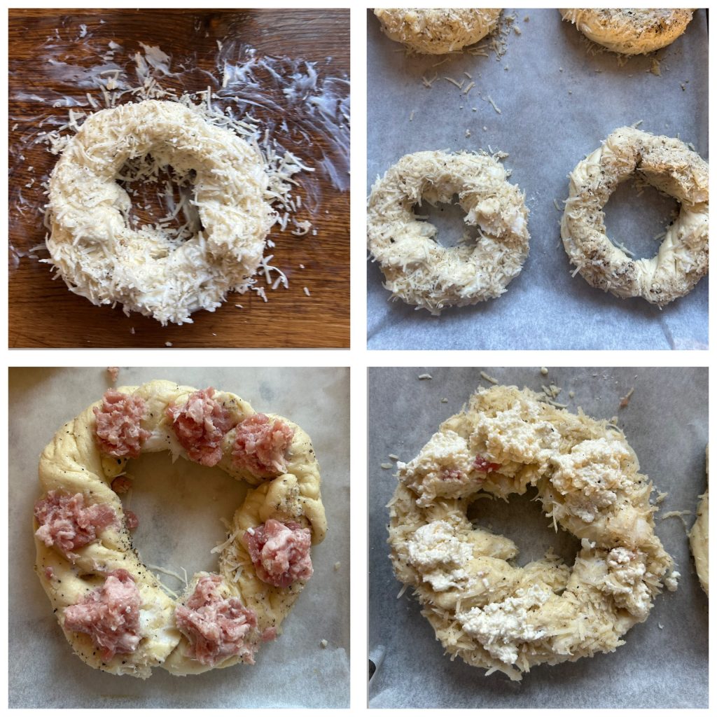 Forme aus jedem Stück eine Kugel und lass sie mindestens 2 Stunden an einem warmen Ort unter Plastikfolie ruhen, bis sie sich verdoppelt hat. Bereite eine Mischung aus Käse und schwarzem Pfeffer vor und stelle sie beiseite.