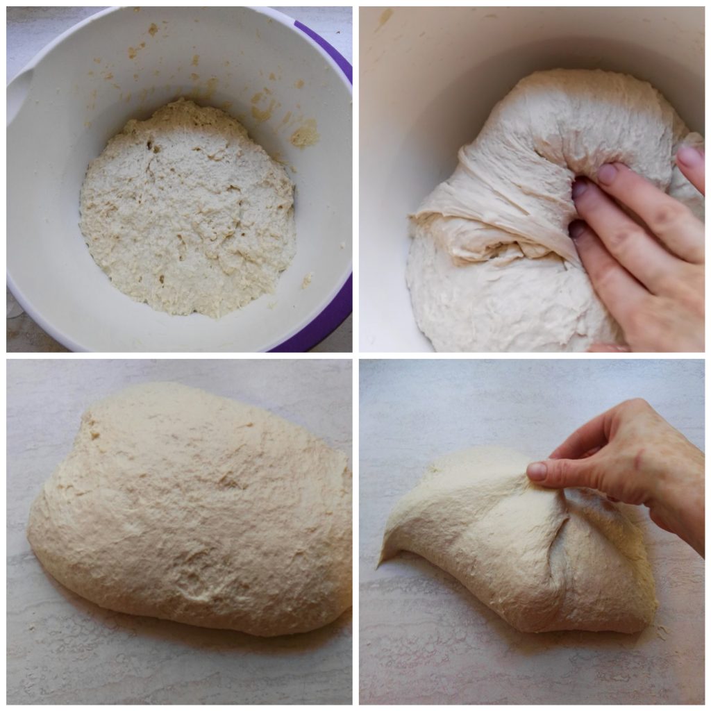 Fahrt fort mit Dehn- und Falttechniken in der Schüssel: klappt die Teigränder zur Mitte. Macht zwei Serien von Faltvorgängen im Abstand von jeweils zehn Minuten, dann stürzt den Teig auf die Arbeitsfläche und faltet die Ränder wieder zur Mitte.
