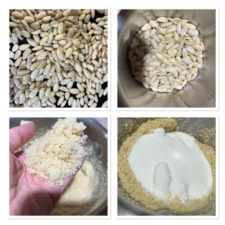 Lass die Mandeln bei 50 °C eine Stunde trocknen und mahle sie kalt zu einem recht feinen Mehl (kaufe kein fertiges Mandelmehl – das ist dafür nicht geeignet). Mische das Mandelmehl mit dem Zucker und mahle noch einmal, bis eine glatte Textur entsteht.