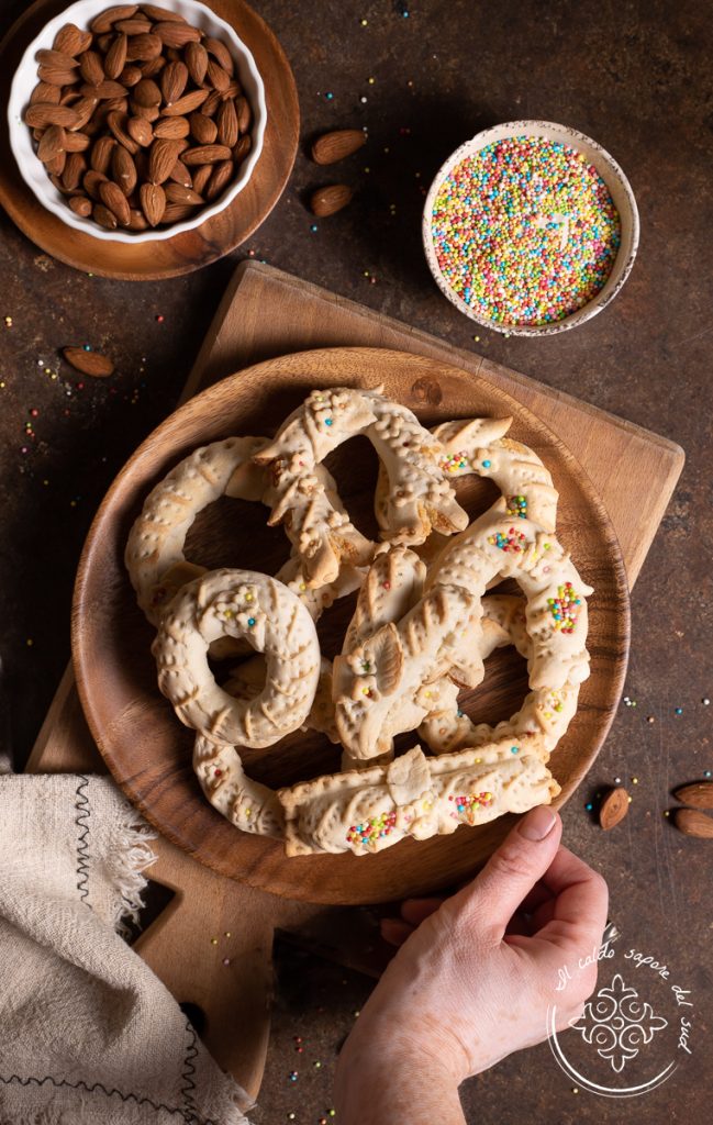 Cuddureddi aus Caltagirone mit Mandeln oder auf Italienisch „collorelle di Calatagirone“. Als meine Freundin mir zum ersten Mal von diesen Süßigkeiten erzählte, muss ich sagen, dass ich sie nicht kannte. Und trotzdem ist es seltsam, dass ich als Sizilianerin und Catanesin diese Köstlichkeiten, die genau in meiner Provinz zubereitet werden, nicht kannte. „Cuddureddi“ auf Sizilianisch bedeutet Krönchen, deshalb hat es mich ein wenig überrascht, sie „collorelle“ zu nennen. „Collorelle“ bedeutet eigentlich nichts Konkretes, denn wenn man es wörtlich übersetzen wollte, müsste man „Krönchen von Caltagirone“ sagen – und in Sizilien gibt es, glaubt mir, viele verschiedene Süßigkeiten, die „Krönchen“ oder „cuddureddi“ heißen, alle unterschiedlich. Aber die Namensdiskussion beiseite: kommen wir direkt zur Sache und zu den spezifischen Merkmalen einer Zubereitung, die nicht nur gut schmeckt, sondern auch wunderschön aussieht. Gefüllt mit Mandelnougat, eingedicktem Most oder sogar Honig sind die „cuddureddi di Caltagirone“ Süßigkeiten mit weichem, köstlichem Kern, umhüllt von einer dünnen Teigschicht aus Mehl, Wasser, Zucker und Schmalz. Cuddureddi herzustellen ist keineswegs schwierig, im Gegenteil, aber bei der Zubereitung gibt es einen entscheidenden Schritt: die Dekoration mit speziellen Dekorzangen, Geduld und Fantasie.
