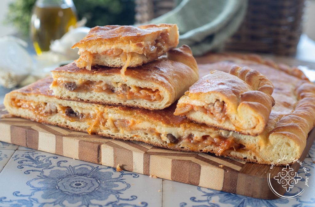 Cuddureni di Lentini mit Zwiebeln und Salsiccia. Der sizilianische cudduruni, im Arche des Geschmacks von Slow Food aufgenommen, ist ein rustikales, gefülltes Fladenbrot auf Basis eines Teigs aus fein gemahlenem Hartweizengrieß. Er wird in der Gemeinde Lentini in der Provinz Syrakus zubereitet und, ähnlich wie die scacciata catanese in ihren verschiedenen Ausprägungen, die Scacce ragusane oder das Sfincione palermitano, zu den bekanntesten sizilianischen Backwaren und ist außerdem ein Grundpfeiler der sizilianischen Küche und der Großmutter-Rezepte, die in unserer Region oft zubereitet werden.