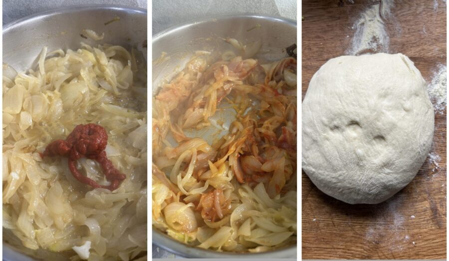 • Während der Teig geht, schält und schneidet ihr die Zwiebeln in Scheiben, gebt sie in eine Pfanne mit einem großzügigen Schuss Öl und etwas Salz und lasst sie weich werden. Gebt dann ein Glas Wasser dazu und lasst sie bei mittlerer Hitze weitergaren, bis sie weich sind.