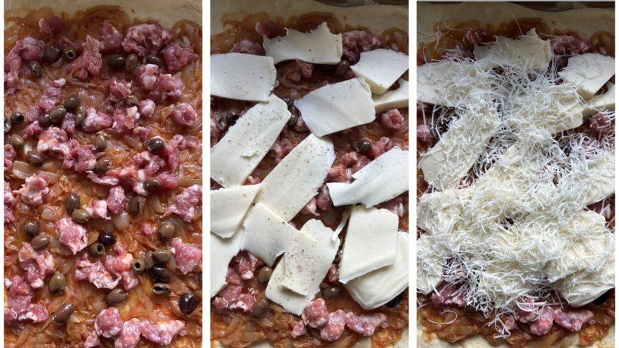 • mit ausgelöster und vom Darm befreiter Salsiccia, den schwarzen sizilianischen Oliven (oder, wie bei mir, den Oliven, die ihr zuhause habt), dem in Scheiben geschnittenen Primo Sale oder Tuma bzw. einem Fadenkäse. Streut etwas Pfeffer darüber und verteilt eine Handvoll geriebenen Käses.