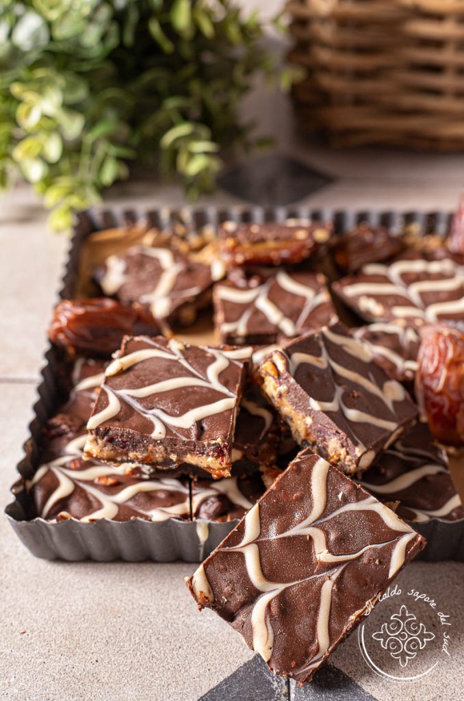Wenn ihr ein kompakteres Ergebnis wollt, presst die Datteln gut in der Basis zusammen: Das ist der entscheidende Schritt, um perfekte Dattel‑Schokoladenriegel zu erhalten.