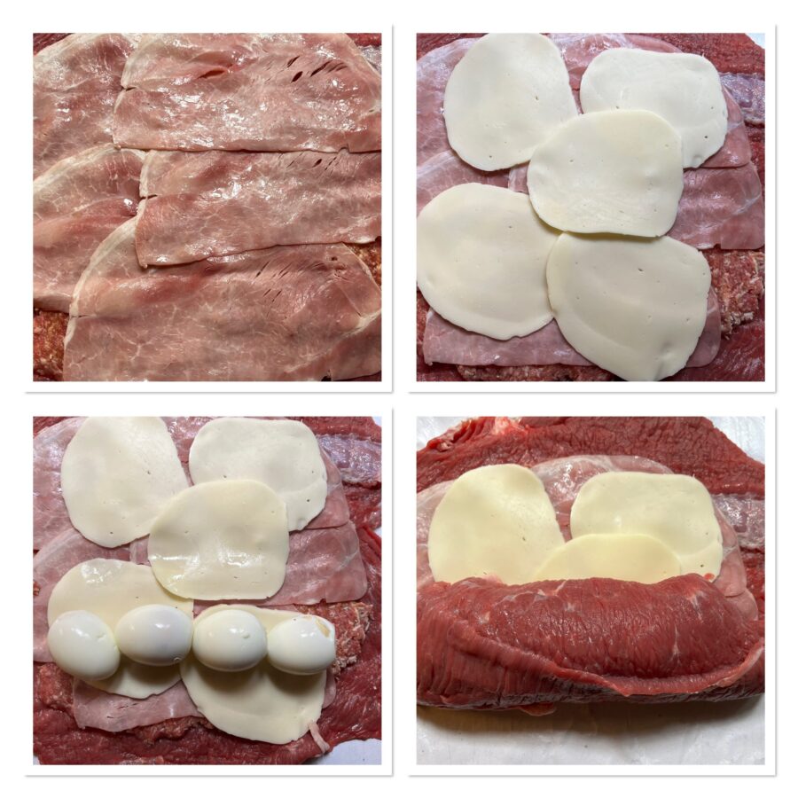 Legt die Scheiben von Schinken und Käse darauf und platziert die gekochten Eier am langen Rand des Rechtecks.