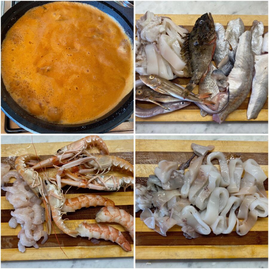 Gebt in die kochende Brühe den filetierten Fisch und die vorbereiteten Suppenfische, wartet etwa 5 Minuten und fügt dann die Calamari hinzu.