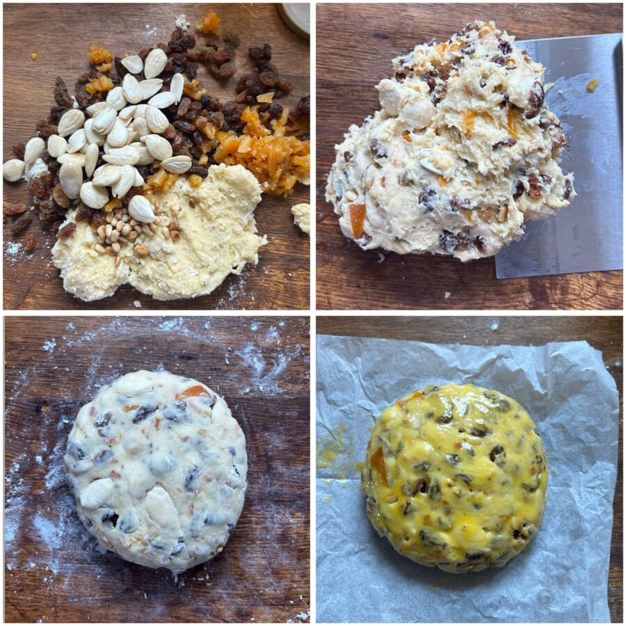 • Verarbeitet den Teig nicht zu lange, wie bei einem Mürbteig, und hebt dann die Rosinen, die kandierten Früchte und einen Teil der Mandeln unter.