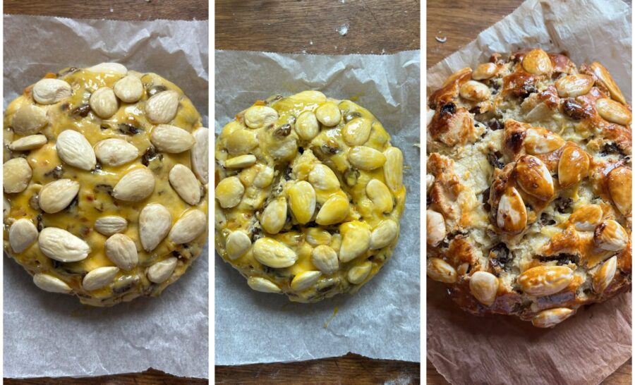 Formt mit Hilfe einer Teigkarte (Spatel) und etwas Mehl eine etwas flache Kugel. Bestreicht sie mit Ei, bedeckt die Oberfläche mit den Mandeln und bestreicht auch diese mit dem Eigelb.