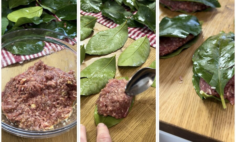 Stellt euch vor, ihr seid auf dem Land, wollt Fleischbällchen über glühender Kohle grillen und habt keine Ahnung, wie ihr das machen sollt. Stellt euch einen Zitronenbaum in eurer Nähe vor, mit duftenden, grünen Blättern…stellt euch das vor und dann ein Geistesblitz: Wir grillen die Fleischbällchen auf Zitronenblättern!!!