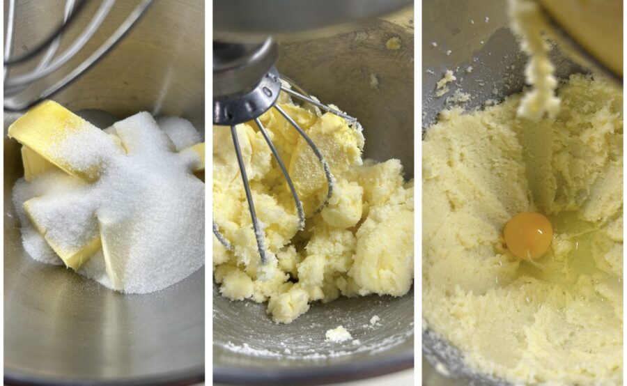 Während der Teig ruht, bereitet ihr die Frangipane-Creme zu. Schlagt in der Küchenmaschine Butter und Zucker schaumig und gebt dann die Eier nacheinander dazu.