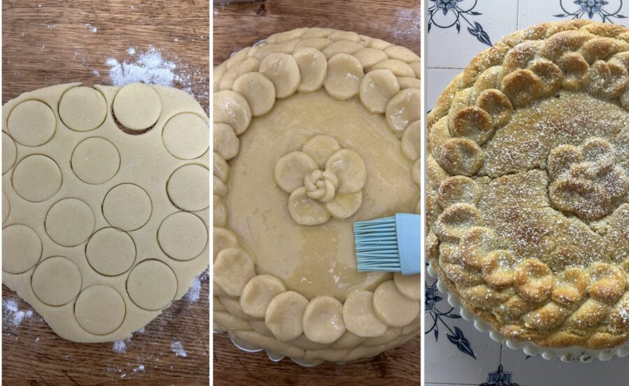 füllt sie mit der Frangipane-Creme. Verwendet die zweite Teighälfte, um die Tarte zu bedecken – entweder einfach mit einer Teigplatte oder mit Dekoren, wie ich es auf den Fotos unten gemacht habe.