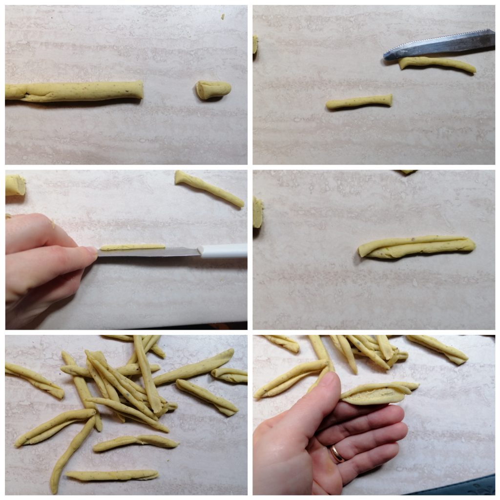 Zieht den Teig aus und formt dünne Stränge, schneidet sie so, dass sie etwa 4 cm lang sind. Dann zieht ihr sie mit einem Messer längs entlang, wie auf dem Foto zu sehen.