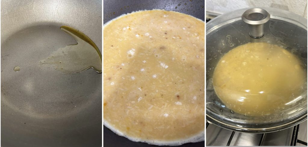 gießt sie hinein. Deckt mit einem Deckel ab und lasst sie bei niedriger bis mittlerer Hitze etwa 10 Minuten garen, dann wendet mit Hilfe eines Tellers die Frittata um und gart sie weitere 5 Minuten.