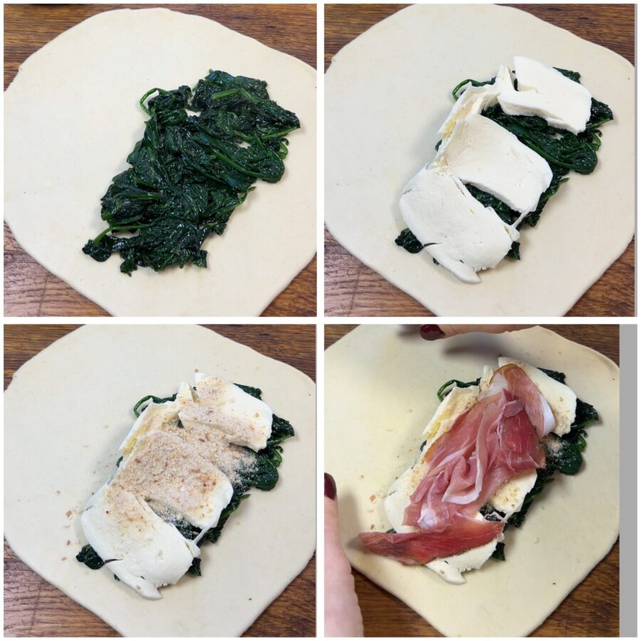 Rollt jede Kugel zu einer Scheibe von etwa 2 mm Dicke und ca. 22 cm Durchmesser aus. Füllt mit Spinat, Mozzarella für Pizza oder dem gewählten Käse, verteilt einen gestrichenen Esslöffel Semmelbrösel, um die Feuchtigkeit des Käses aufzusaugen, fügt noch ein oder zwei Scheiben Speck hinzu und klappt die Scheibe zur Halbmondform zusammen.