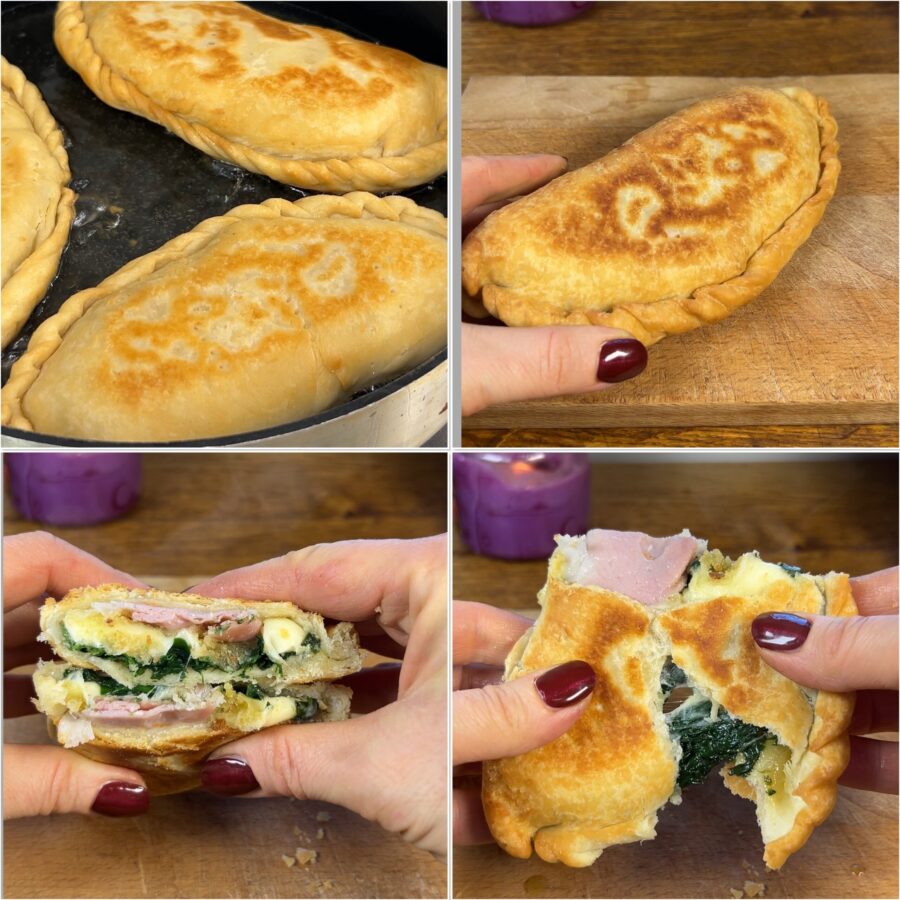 Frittierte Calzone mit Spinat, ohne Gehzeit, ohne Hefe, Milch und Eier: eine Vorspeise und eine schnelle Abendessenslösung, die ihr zubereiten könnt, wenn es schnell gehen muss. Keine Idee für das Abendessen oder wenig Zeit? Ich habe einen Vorschlag für euch: bereitet Calzone ohne Milch und Hefe zu, frittiert und gefüllt mit Spinat, Mozzarella und Speck! Erinnert ihr euch an unsere Kartoffel-Pfannkuchen und die Version mit Frühlingszwiebeln? Diese zwei Rezepte ohne Gehzeit haben euch überzeugt, aber diese Calzone werden euch regelrecht begeistern – ich bin sicher, ihr werdet sie oft zubereiten und die Füllung wie bei den klassischen Cartocciate mit Schinken und Mozzarella variieren! Für unseren Teig ohne Hefe verwenden wir Wein, genau wie bei den frittierten Ricotta-Raviole mit Weinteig, allerdings weißen Wein; ansonsten gibt es keine weiteren Vorschriften und keine Sorge: der Alkohol verdampft beim Garen und hinterlässt nur ein feines Aroma. Ich empfehle nicht, den Wein durch Wasser zu ersetzen, denn gerade er macht unsere Calzone knusprig, goldbraun und trocken mit unverwechselbarem Geschmack! Ab in die Küche: diese frittierten Calzone ohne Hefe sind unglaublich lecker. Wenn ihr auf dem Laufenden bleiben wollt, folgt meiner Seite Facebook und meinem Profil Instagram.