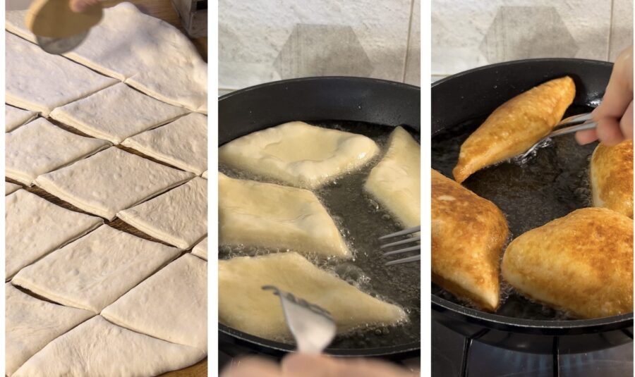 • Nach ungefähr 2–3 Stunden sollte sich das Volumen des Teigs verdoppelt haben. Bestäubt die Arbeitsfläche mit Mehl und stürzt den Teig vorsichtig darauf, ohne ihn zu stark zusammenzudrücken. Rollt ihn mit dem Nudelholz aus, ohne ihn zu quetschen, sodass eine etwa 1 cm dicke Teigplatte entsteht. Schneidet dann mit einem Pizzaroller geometrische Formen: Ich habe Rauten von etwa 7–8 cm Kantenlänge gemacht. Erhitzt in einer Pfanne reichlich Öl zum Frittieren; ich verwende immer High-Oleic-Sonnenblumenöl (prüft die Zusammensetzung auf der Verpackung). Ein gutes Öl mit hohem Rauchpunkt ist unerlässlich, um eine gesündere Frittierung zu erzielen. Taucht die Teigstücke in das heiße Öl (170°C) und frittiert sie ca. 5 Minuten oder bis sie goldbraun sind. Holt sie mit einer Schaumlöffel heraus und legt sie auf Küchenpapier ab; sobald ihr fertig seid mit Frittieren, füllt sie sofort, denn obwohl diese Krapfen kalt noch gut schmecken, sind sie heiß oder lauwarm einfach wunderbar.