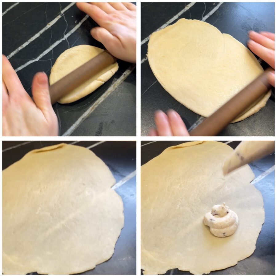 Setzt kleine Häufchen der Füllung mit genügend Abstand auf den ausgerollten Teig – ihr könnt einen Löffel oder einen Spritzbeutel verwenden. Klappt den Teig über die Füllung und drückt rundherum vorsichtig, um Luft zu entfernen.