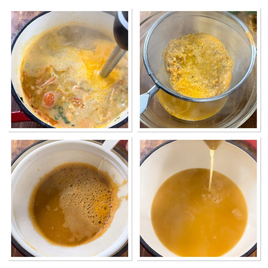 • Püriert die Köpfe und Schalen, die in ihrer eigenen Brühe gekocht wurden, und seiht die Mischung zuerst durch ein feines Sieb und danach durch ein Mulltuch oder Baumwolltuch. Wenn ihr eine dichtere Bisque möchtet, lasst sie erneut auf dem Herd einkochen, bis die gewünschte Konsistenz erreicht ist.