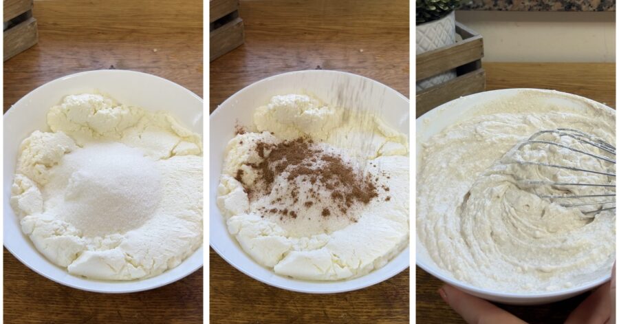 Sobald die Ricotta bereit ist, gebt Zucker, Zimt, Vanillepulver oder Vanilleextrakt hinzu und rührt alles gut durch. Unsere Ricotta-Creme ist nun einsatzbereit und lässt sich bis zu 2 Tage luftdicht verschlossen im Kühlschrank aufbewahren.