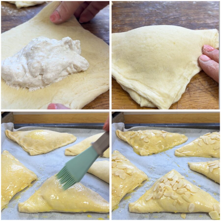 Nach der langen Ruhezeit teilt ihr das Paket in zwei gleiche Hälften. Rollt die erste Hälfte sehr dünn aus – etwas mehr als 0,5 mm – und schneidet 8 Rechtecke mit einer langen Seite von etwa 12 cm aus. Verschließt die Ränder sorgfältig, damit die Füllung nicht austritt; bedeckt die Teile mit Frischhaltefolie und lasst sie an einem warmen Ort für 1 Stunde gehen.