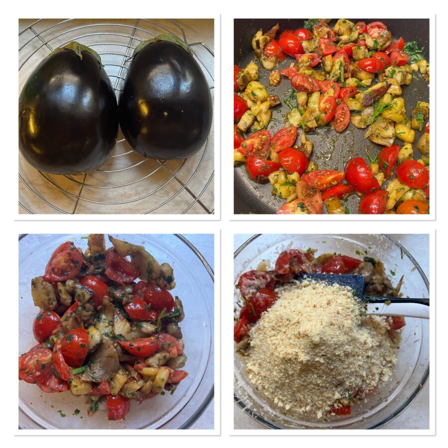 Wenn die Auberginen angeröstet sind, gebt die Kirschtomaten und die Petersilie dazu und lasst alles einige Minuten köcheln. Gebt diese Mischung in eine Schüssel und fügt Semmelbrösel und geriebenen Käse hinzu und vermischt alles gut.