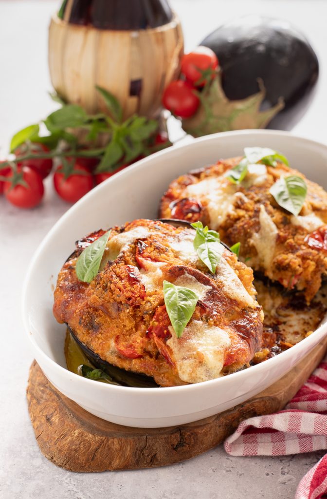 Im Ofen gebackene Auberginen, gefüllt mit Semmelbröseln und Kirschtomaten, ohne Fleisch. Die gefüllten Ofen-Auberginen ohne Fleisch oder vegetarischen Auberginen-Boote sind ein typisches Gericht der süditalienischen Küche und lassen sich auf viele Arten zubereiten. Ich fülle sie auch gerne mit Reis oder mit Nudeln. Schnell und schmackhaft sind sie direkt nach dem Backen ebenso köstlich wie nach ein paar Stunden Ruhezeit; sie sind einfach zuzubereiten und vereinen den Geschmack und das Aroma des Sommers. Die gefüllten Ofen-Auberginen, wie hier zubereitet, sind ein raffiniertes und würziges Gericht, das in wenigen Minuten mit günstigen, einfachen Zutaten gelingt. Ich habe sie in einer vegetarischen Variante mit Kirschtomaten, Mozzarella und Semmelbröseln zubereitet. Sie können als Zweites Gericht, als vollständiges Hauptgericht dienen und sind einfach zu machen: Man halbiert die Auberginen, höhlt sie aus, so dass eine Schale entsteht, und füllt sie ohne Fleisch mit einer vegetarischen Füllung oder alternativ mit Hackfleisch. Anschließend werden sie im Backofen gegart, bis eine goldbraune und gratinierte Oberfläche entstanden ist — köstlich — und die Füllung weich und Eins mit der Schale geworden ist! Wollt ihr zu Hause die Rezeptur für gefüllte Auberginen mit Semmelbröseln, Kirschtomaten und Mozzarella zubereiten? Folgt mir in die Küche, aber bevor ihr loslegt, schaut euch gern meine Sammlung von Rezepten zu Nudelgerichten mit Auberginen und leckeren Auberginen-Rezepten an. Wenn ihr immer über meine Ideen in der Küche informiert bleiben wollt, könnt ihr meiner Facebook-Seite (hier) und meinem Instagram-Profil (hier) folgen.