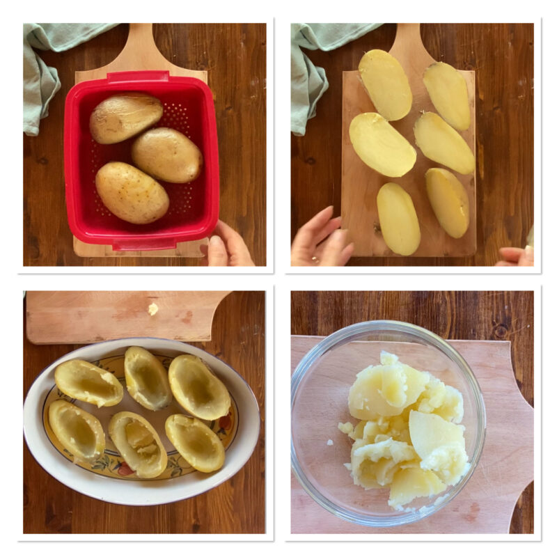 Schneidet die Kartoffeln halb durch, lasst die Schale dran (sie hilft, die Form zu halten), und höhlt sie vorsichtig mit einem Teelöffel aus. Das Herausgelöste gebt ihr in eine Schüssel.