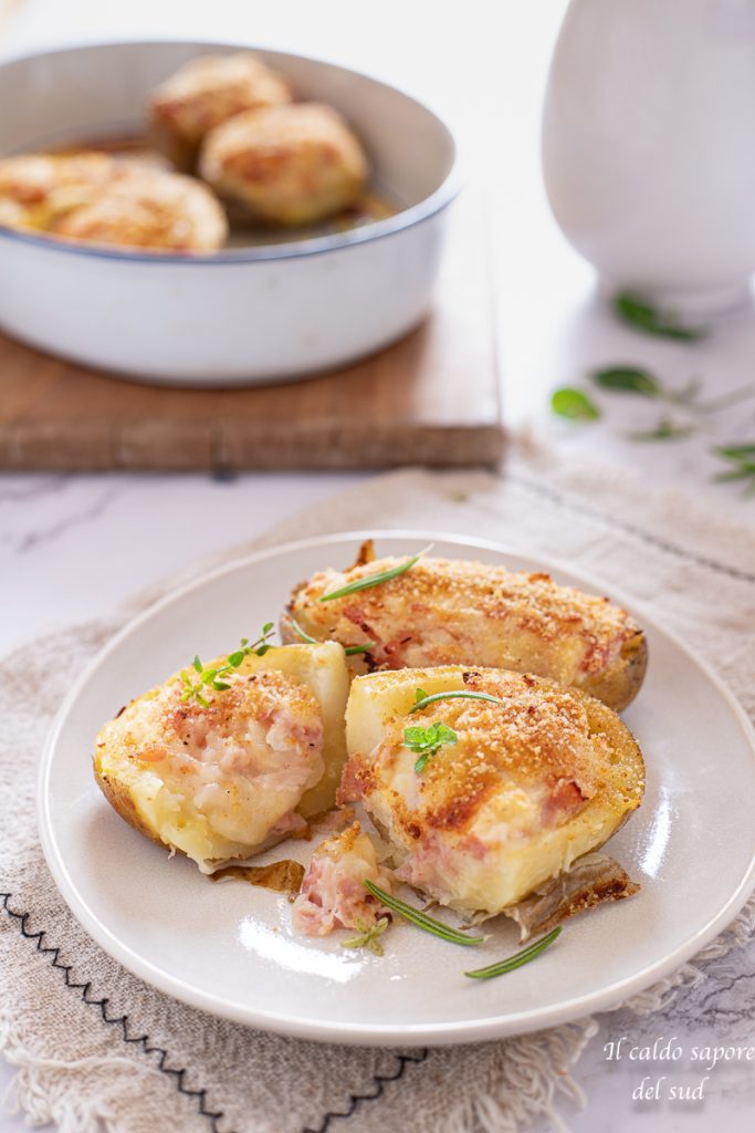 Gefüllte Kartoffeln aus dem Ofen mit Kochschinken und Provola — ein einfaches und raffiniertes Hauptgericht, aber auch eine leckere Beilage oder Vorspeise, genau wie die einzelnen Kartoffeltörtchen, die wir bisher gemacht haben, oder wie die gefüllten Kartoffeln mit Wurst und Spinat oder die gefüllten Kartoffeln mit Mortadella und Käse.