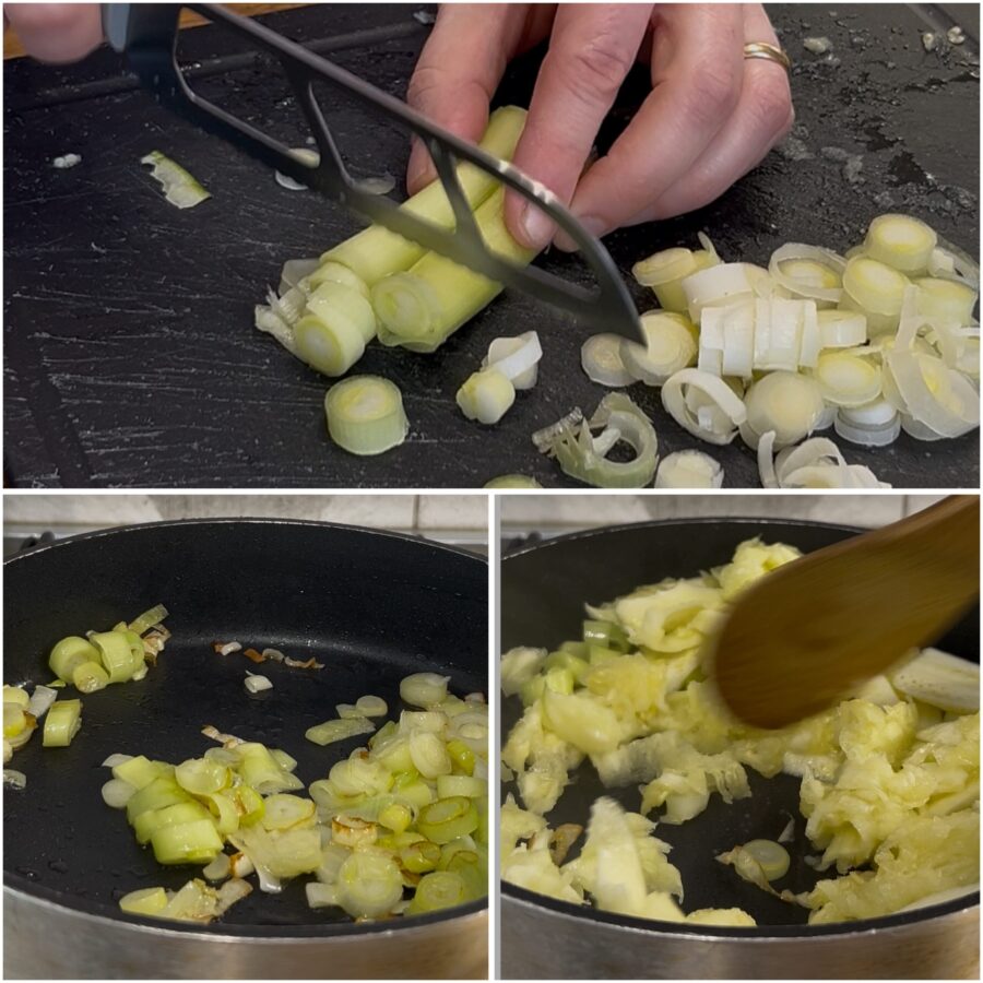 • Das ausgelöste Zucchinifleisch in Stücke schneiden und mit Frühlingszwiebel, etwas Öl und Salz in der Pfanne anbraten.