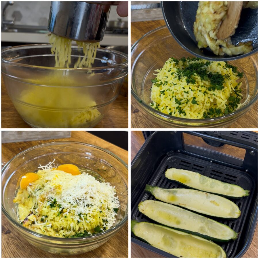 Die Innenseite der Zucchini mit Olivenöl bestreichen und leicht salzen. In eine Auflaufform oder in den Korb der Heißluftfritteuse legen und 10–15 Minuten bei 180°C Umluft garen, oder in der Heißluftfritteuse genauso zubereiten.
