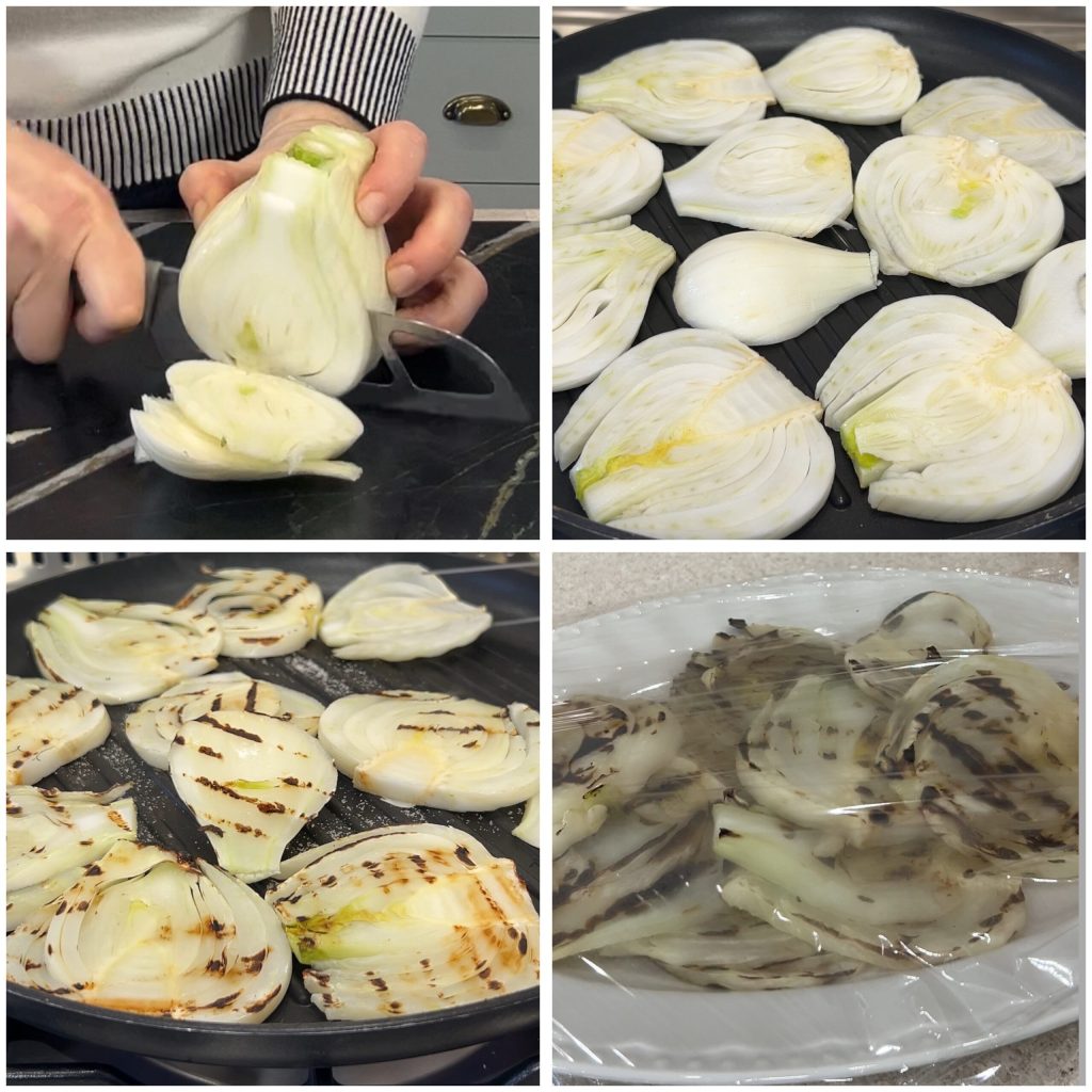 Eine Grillpfanne oder eine beschichtete Grillplatte erhitzen. Die Fenchelscheiben nebeneinander ohne Überlappung auslegen, leicht salzen und bei mittlerer Hitze grillen. Einmal wenden, bis sie zart sind und auf beiden Seiten schöne Grillstreifen haben. Nach und nach auf einen Teller legen und mit Frischhaltefolie abdecken, damit sie warm bleiben.