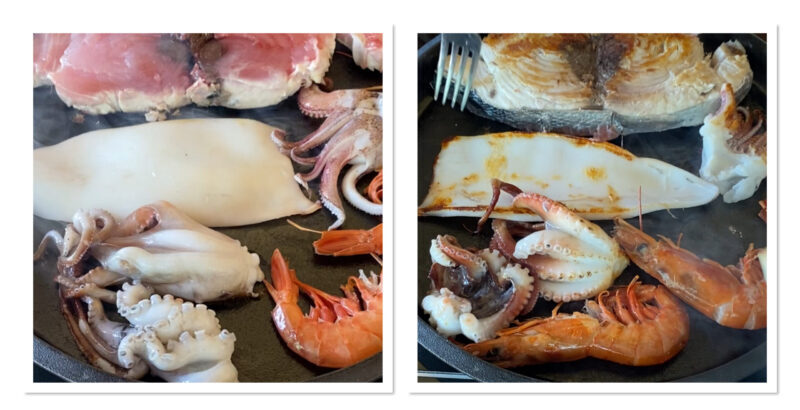 Neulich habe ich aber entdeckt, dass man eine Fischgrillplatte wie im Restaurant auch auf Gusseisen machen kann. Wenn man die Platte auf die ideale Temperatur bringt, garen alle Zutaten perfekt: sie verschließen sich außen, karamellisieren die Zucker (Maillard-Reaktion) und bleiben innen zart und saftig.