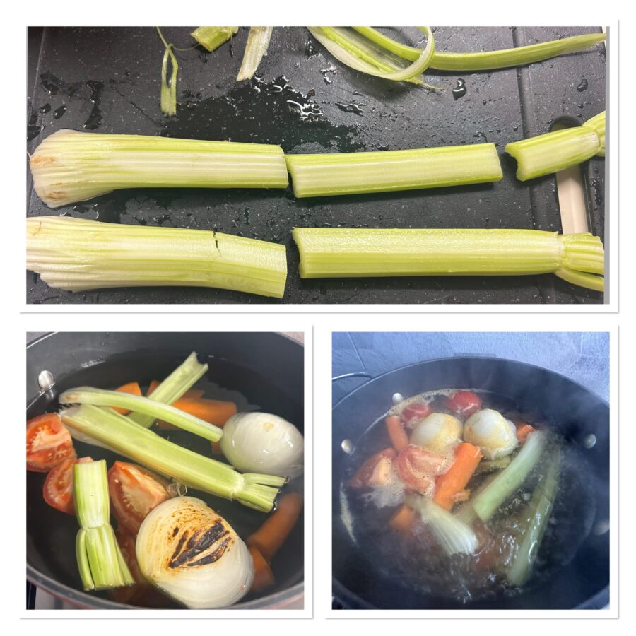 Für die Gemüsebrühe die Zwiebel schälen, in eine beschichtete Pfanne legen und sie 4–5 Minuten bei starker Hitze schmoren lassen, ohne Öl oder Butter hinzuzufügen. Die Karotten schälen und in große Stücke schneiden, die Tomaten vierteln, die Selleriestange von den Blättern befreien und in zwei oder drei Stücke teilen.