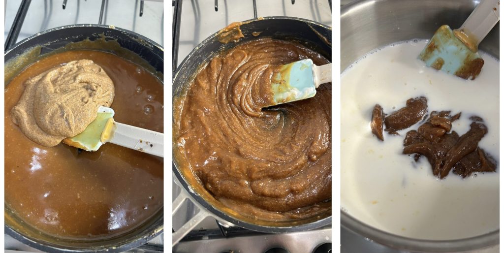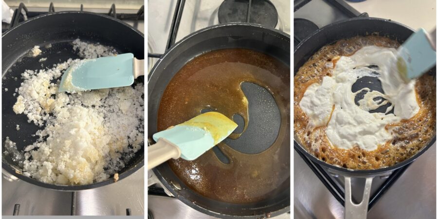 • Gebt den Haushaltszucker (Saccharose) in einen kleinen Topf oder eine Pfanne mit dickem Boden und stellt ihn bei mittlerer Hitze auf den Herd. Rührt zwischendurch, bis der Zucker langsam schmilzt und eine schöne bernsteinfarbene Farbe annimmt. Gebt die sehr heiße Sahne dazu, rührt schnell, um Klumpen zu vermeiden, und falls nötig noch etwas Milch aus der Gesamtmenge.