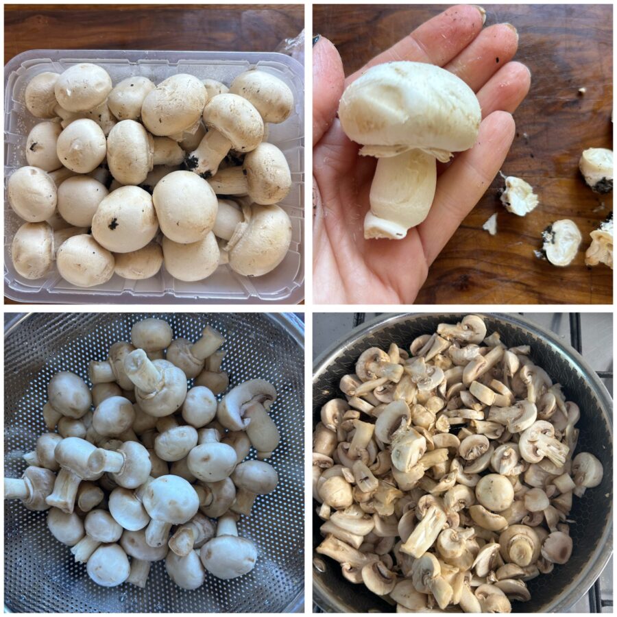 Beginnt damit, die Pilze zu putzen: entfernt die Wurzelenden, spült sie kurz unter fließendem Wasser ab, tupft sie trocken und schneidet sie in Scheiben — oder verwendet fertig geschnittene Pilze.