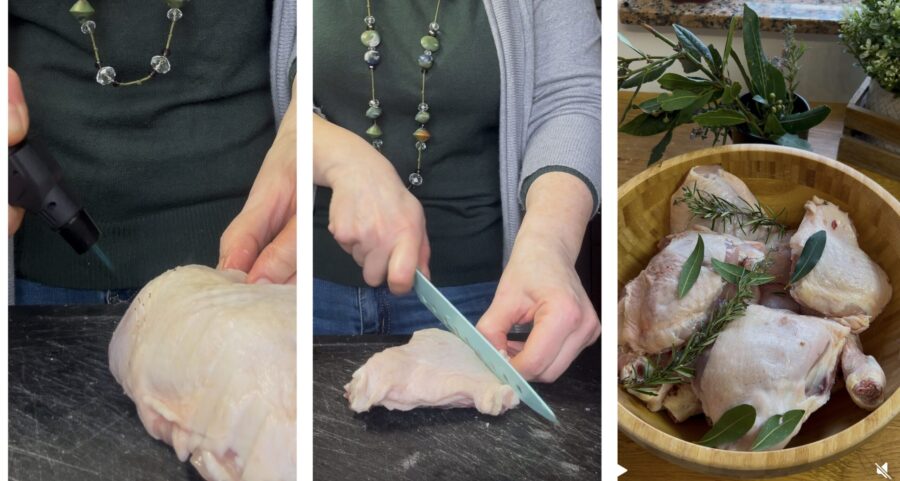 Für dieses Rezept kannst du das Hähnchen als ganzes Stück portionieren, Keulen und Oberschenkel, Schenkel oder was immer du bevorzugst verwenden. Denk daran, eventuell vorhandene Federkiele über der Gasflamme oder mit einem Brenner zu entfernen.
