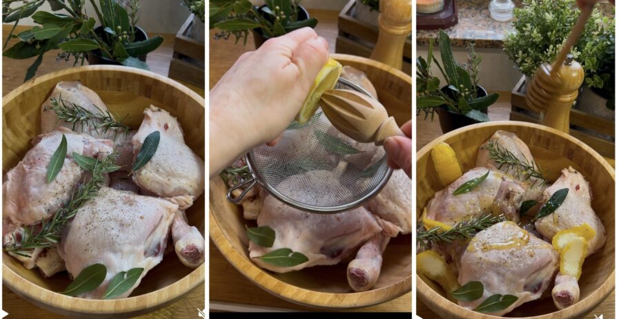 füge Rosmarin, Lorbeer, etwas frisch gemahlenen Pfeffer, Zitronensaft, drei bis vier Streifen Zitronenschale, Salz und Honig hinzu. Gut vermischen und 30 Minuten marinieren lassen.
